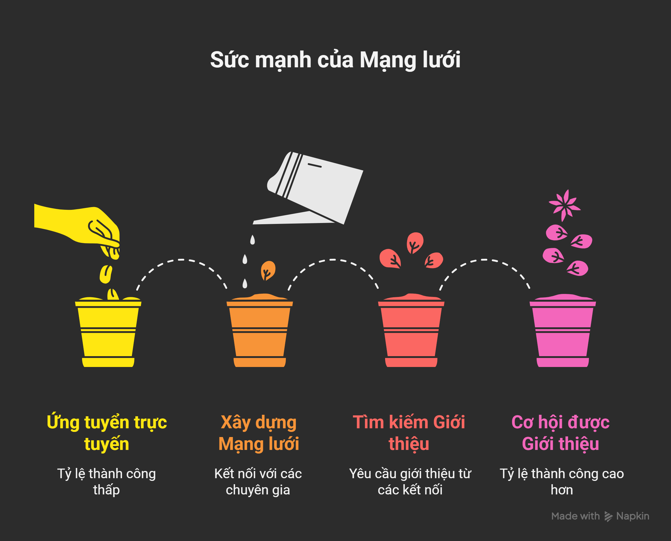 Anh Nguyễn Thành Nhân chưa từng nộp hồ sơ xin việc trực tuyến; tất cả cơ hội đều đến từ mạng lưới quan hệ cá nhân. Anh từng giới thiệu 73 người vào Google, với 15 người trúng tuyển – tỷ lệ thành công cao hơn hẳn so với ứng tuyển thông thường, thường chỉ khoảng 0.2% theo dữ liệu từ Google. Điều này không chỉ dừng lại ở việc làm cá nhân mà còn áp dụng mạnh mẽ vào khởi nghiệp. Theo một báo cáo từ Google for Startups, mạng lưới quan hệ giúp startup tiếp cận nhà đầu tư nhanh chóng hơn, giảm thời gian gọi vốn từ hàng tháng xuống chỉ vài tuần. Cụ thể: